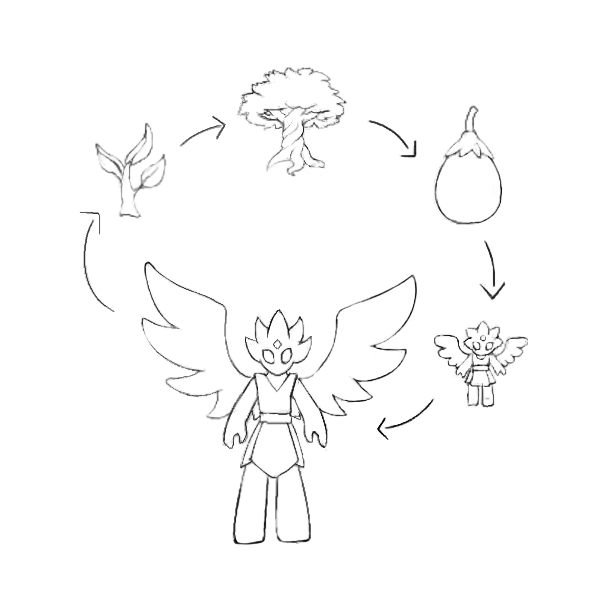 Baby angels are around 30 cm tall, numerous and came from eggs like fruits coming from a divine tree. They grow fast and adults can reach up to 2.5 meters tall. Wings of young angels are too small for them to fly and will grow faster than the rest of their body. A young angel can use telepathy around the age of 3 and starts flying around 5 for a short time. Every new angel will seek for a god to serve. At birth, they are completly white and once they are marked by divine energy they change color relatively to the energy nature.